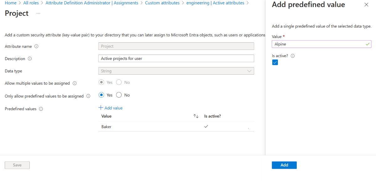 如果“仅允许分配预定义值”为“是”,请选择“添加值”以添加预定义值。 选择现有的预定义值以更改“是否处于活动状态?”设置。
