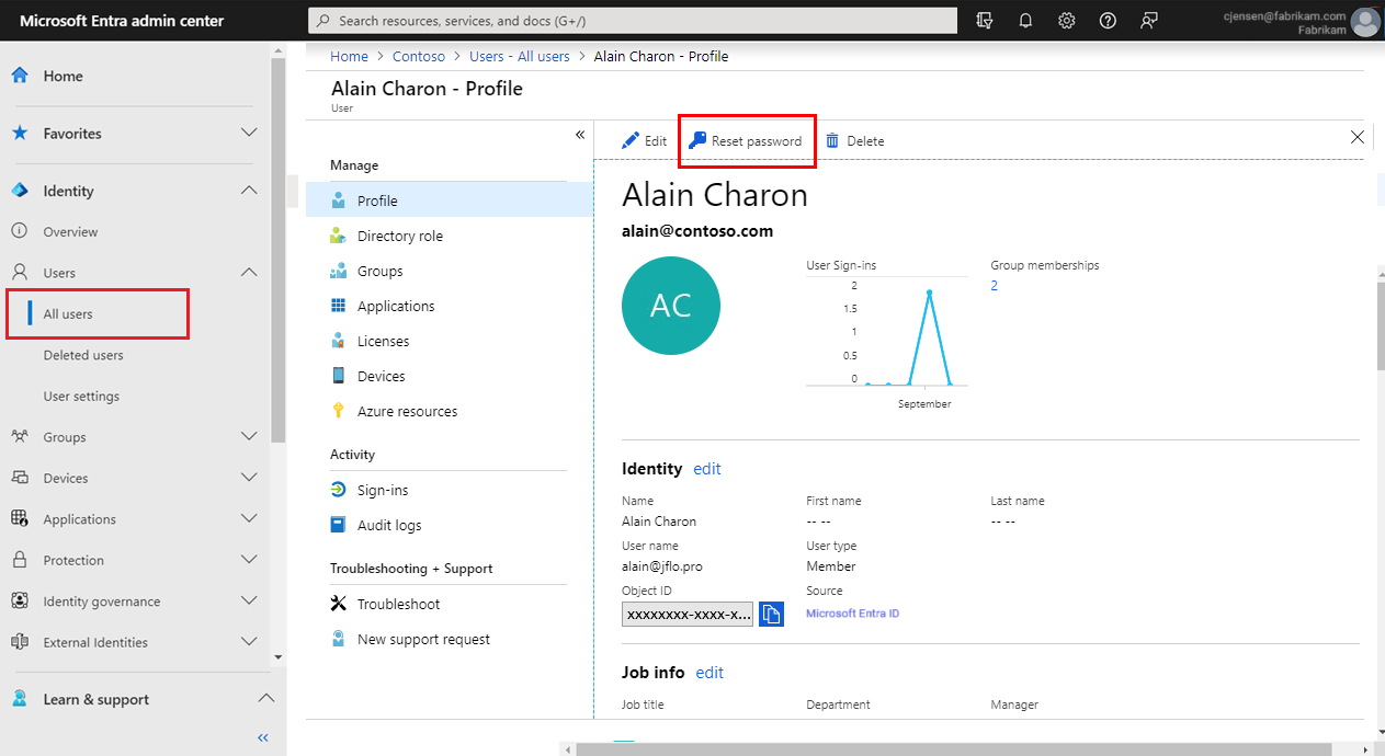 If your user has a source of authority as External Microsoft Entra ID, you are unable to reset the password. Only the user, or an administrator in that tenant, can reset the password.