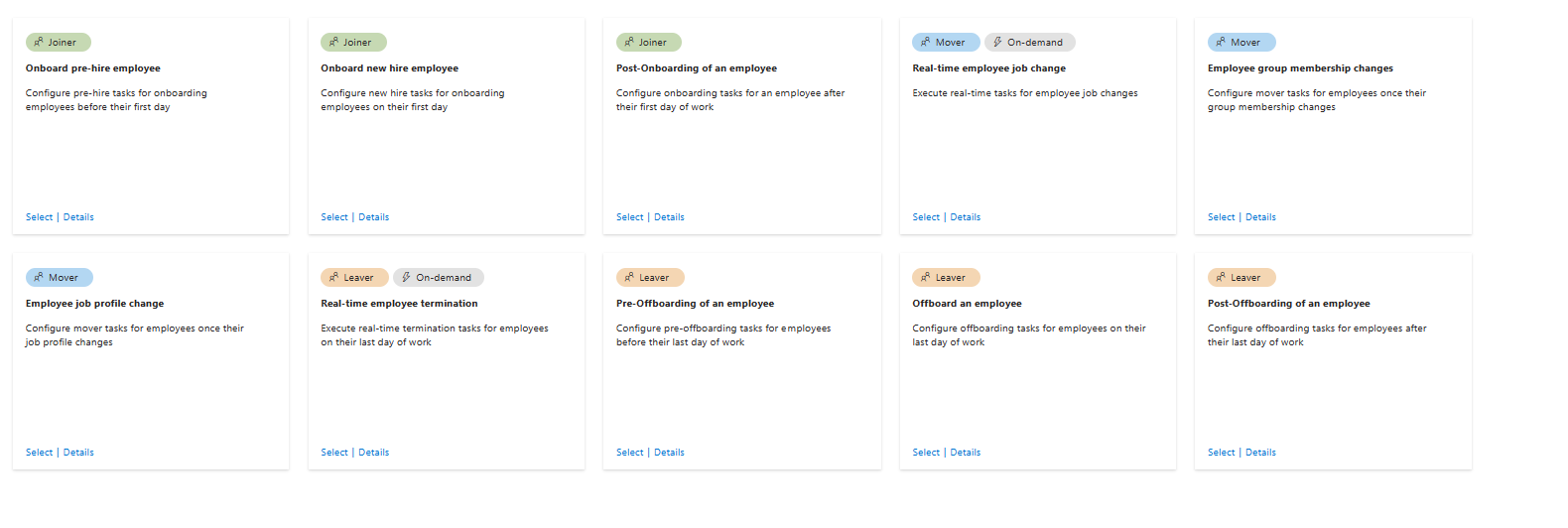如果使用 Microsoft Entra 管理中心创建工作流,可以自定义现有模板来满足组织的需求。 这些模板中有一个适用于入职前的常见场景。