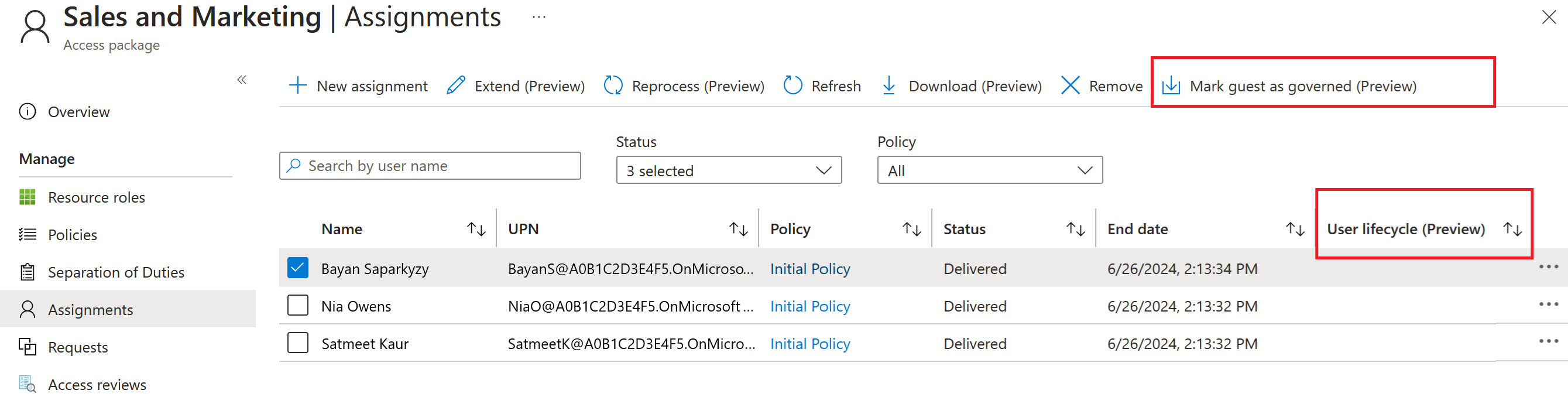 在分配屏幕上,选择要管理其生命周期的用户,然后选择“将来宾标记为已治理”。 只可更改为自己请求访问权限的用户(而不是被分配到访问包的用户)。