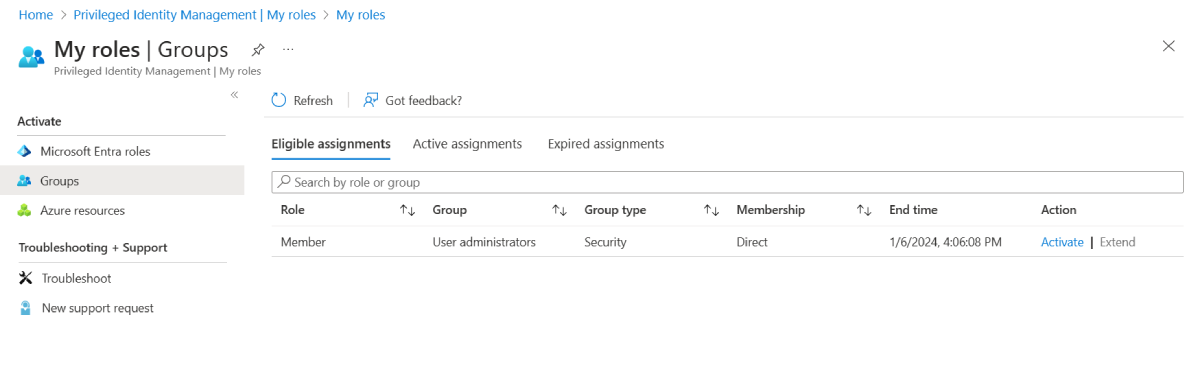 浏览到 ID Governance>Privileged Identity Management>My roles>Groups。