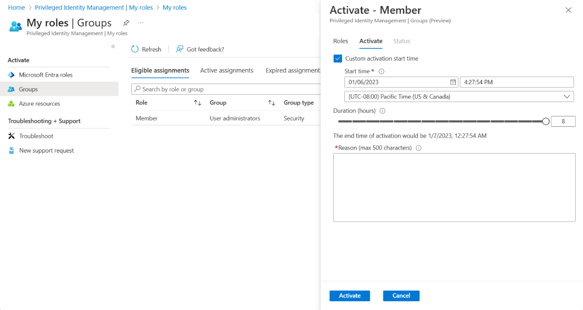 根据组的设置,系统可能会要求你提供激活理由。 如果需要,请在 “原因 ”框中提供理由。