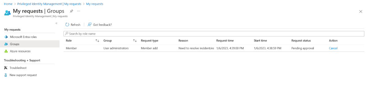 浏览到 ID Governance>Privileged Identity Management>我的请求组。