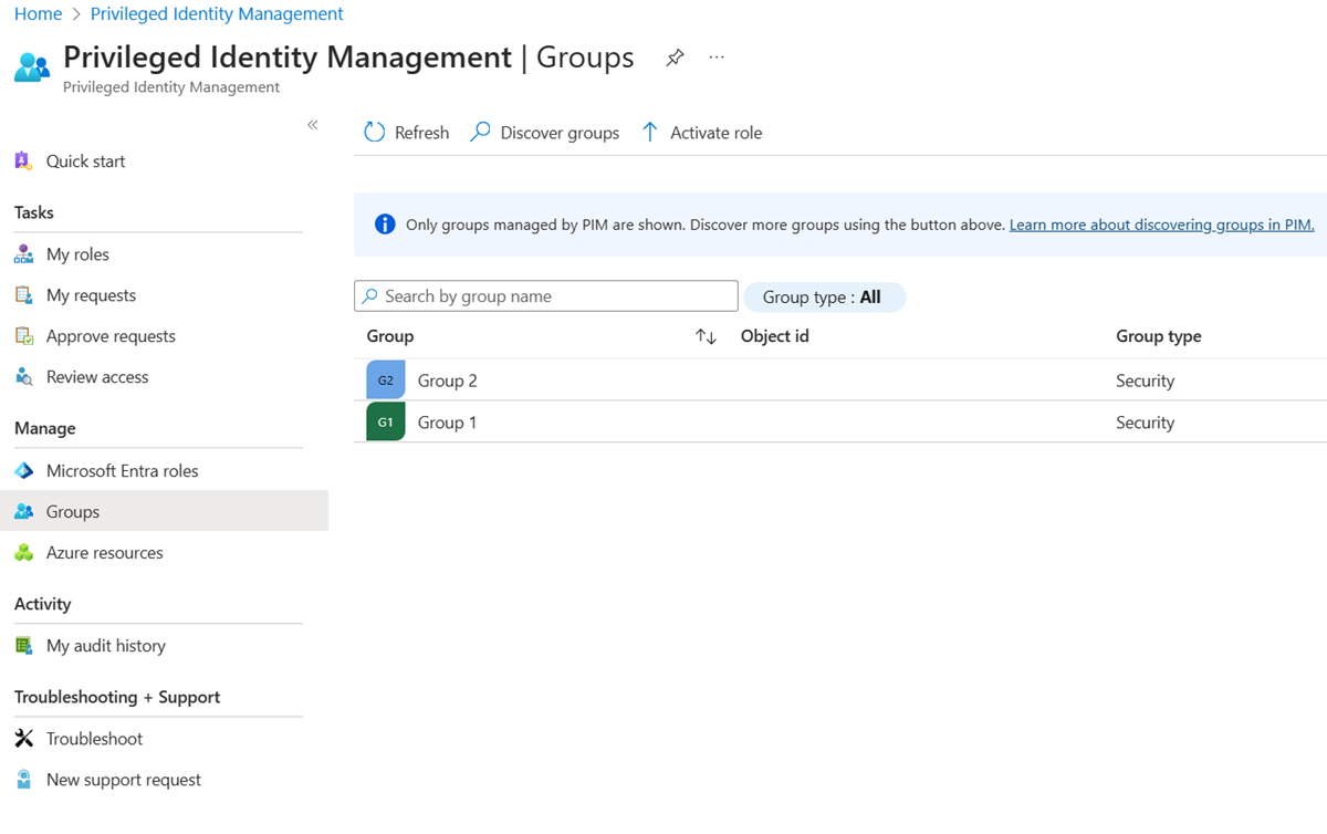 或者,可以使用“组”窗格将组引入 Privileged Identity Management。