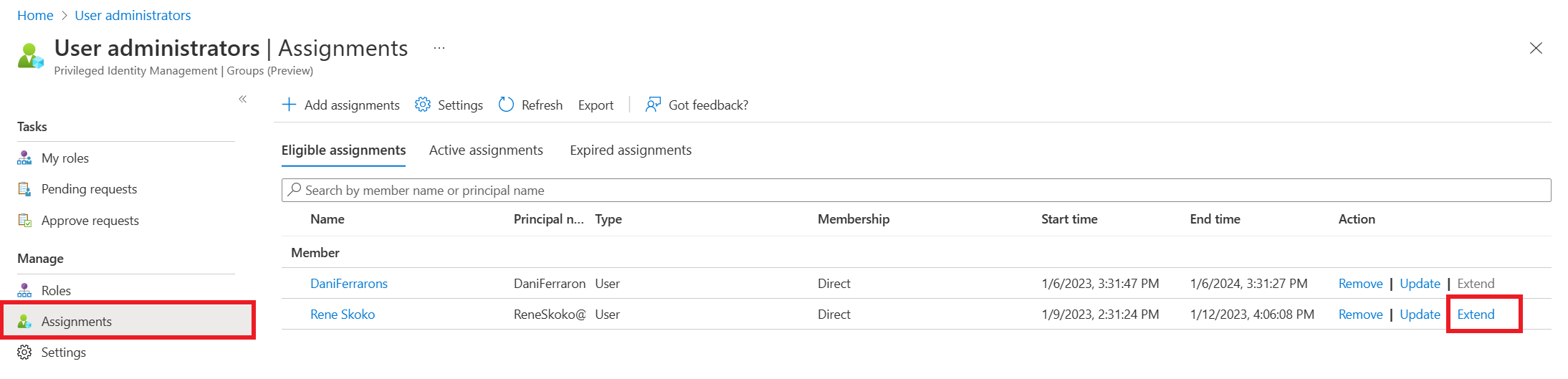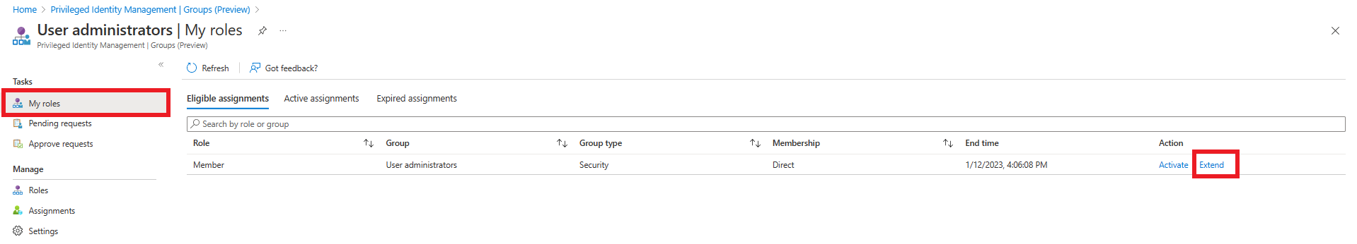 若要延期组分配,请浏览 Privileged Identity Management 中的分配视图。 找到需要延期的分配。 在操作列中选择“延期”。