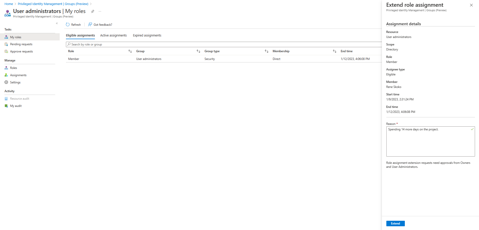 用户分配的组成员身份或所有权可以直接在该组的“分配”页上通过“符合条件”或“活动”选项卡,来延期即将过期的组分配。 用户或组可以请求延期在后续 14 天过期的符合条件且处于活动状态的分配。