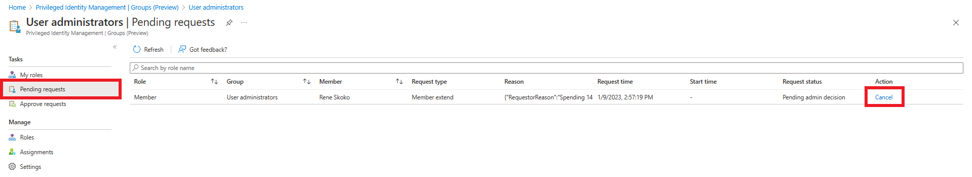 要查看请求的状态或取消请求,请打开组分配的“待处理请求”页面。