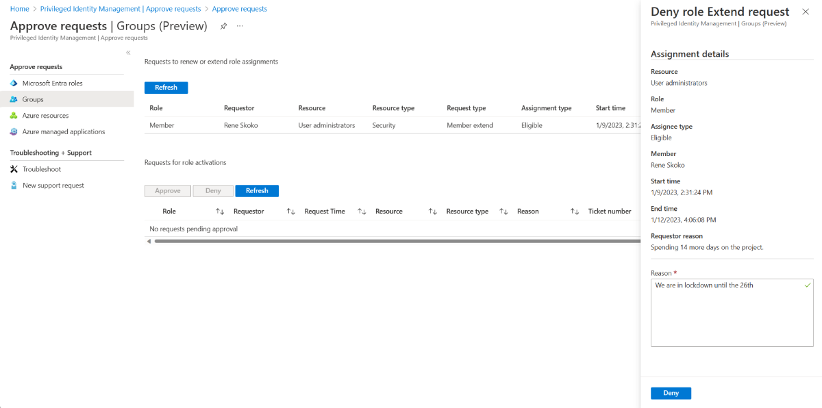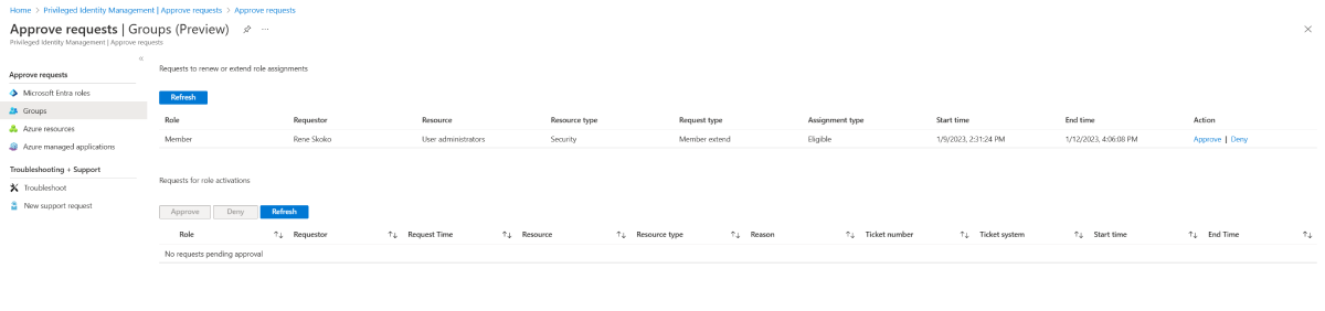 资源管理员可以通过电子邮件通知中的链接,或者通过在 Microsoft Entra 管理中心中访问 Privileged Identity Management 然后在左窗格中选择“审批请求”来访问续订请求。