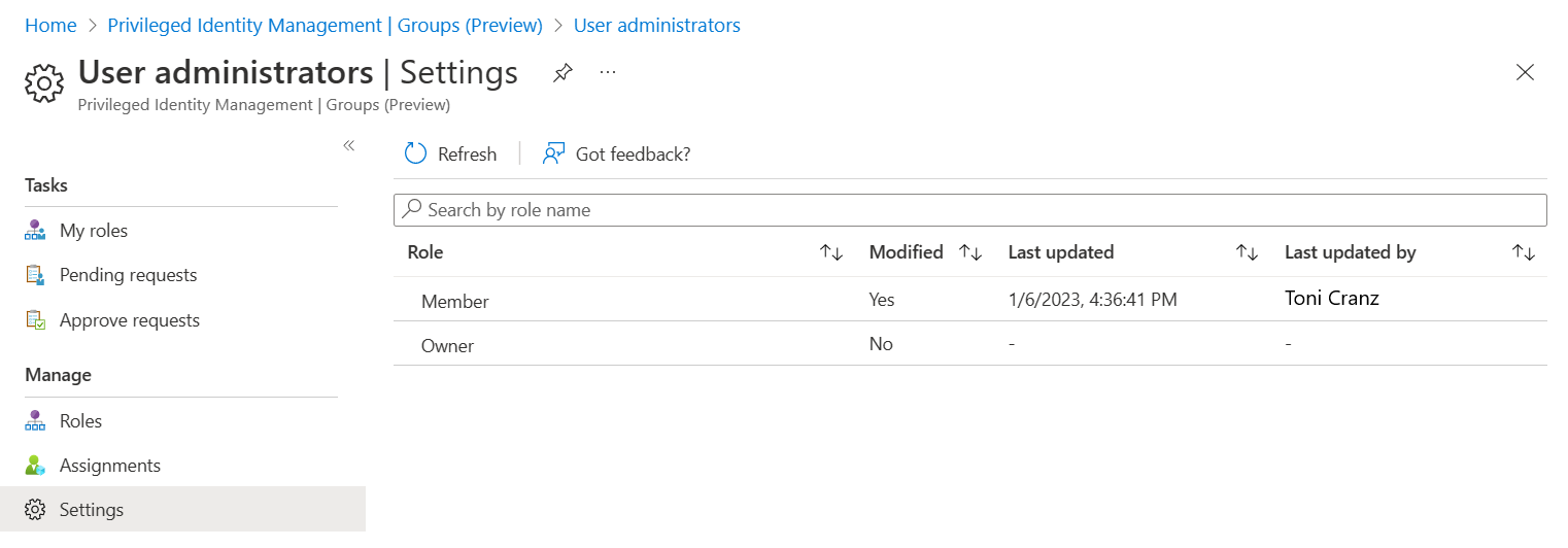 具有可管理组权限的其他角色(例如,不可分配角色的 Microsoft 365 组的 Exchange 管理员)以及分配限定在管理单元级别的管理员可以通过组 API/UX 来管理组,并替代在 Microsoft Entra Privileged Identity Management 中所做的更改。