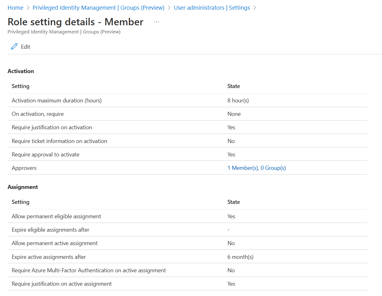 在 Microsoft Entra ID 中适用于组的 Privileged Identity Management (PIM) 中,角色设置定义了成员身份或所有权分配属性。 这些属性需要多重身份验证和审批才可激活、分配最长持续时间、进行通知设置等。 本文介绍了如何配置角色设置并设置审批工作流来指定谁可以批准或拒绝提升特权的请求。