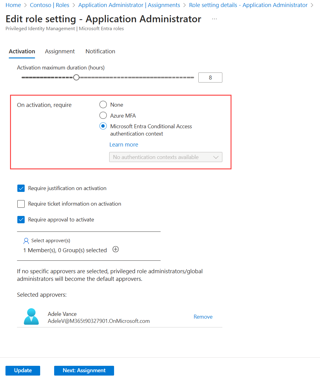 在角色的 PIM 设置中配置身份验证上下文。