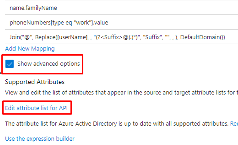 - 向下滚动 “属性映射 ”页。 选择“ 显示高级选项 ”,然后单击 API 链接的“编辑属性”列表 。