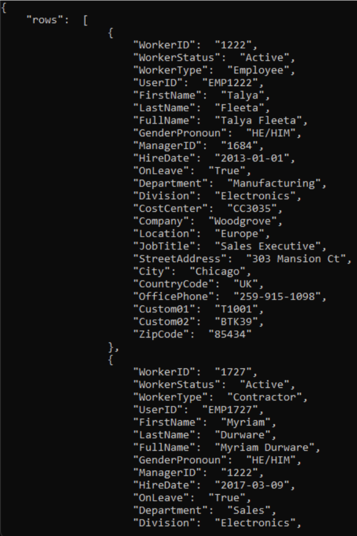 $csvFilePath和$uri脚本中设置正确的值。# Step 1: Read the CSV file $csvFilePath = "C:\Path-to-CSV-file\hr-user-data.csv" $csvContent = Get-Content -Path $csvFilePath # Step 2: Set up the request $uri = "https://az-function-webapp-your-domain/csvtojson" $headers = @{ "Content-Type" = "text/csv" } $body = $csvContent -join "`n" # Join the CSV lines into a single string # Step 3: Send the POST request $response = Invoke-WebRequest -Uri $uri -Method POST -Headers $headers -Body $body # Output and format the JSON response $response.Content | ConvertFrom-JSON | ConvertTo-JSON如果 Azure 函数部署成功,则脚本的最后一行将输出 CSV 文件的 JSON 版本。