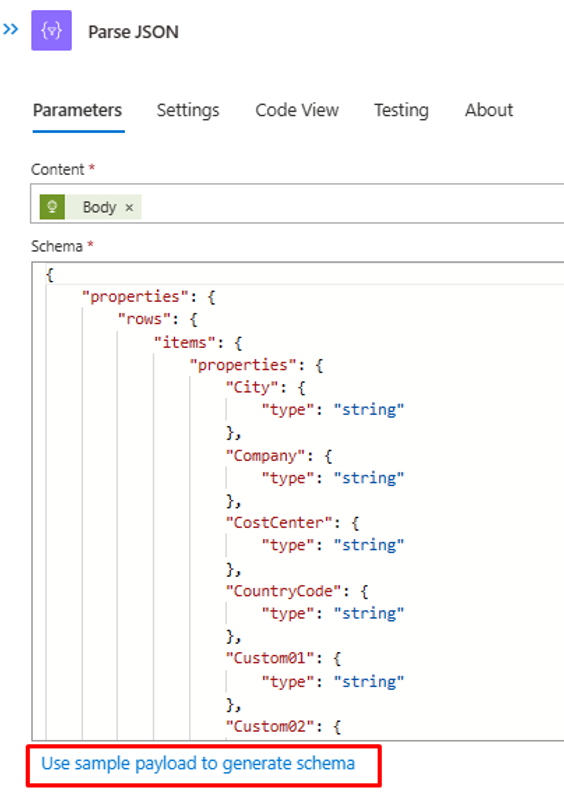 如果 CSV 文件的内容和标头不同,请使用可通过 API 调用 Azure Function 检索到的 JSON 输出更新“解析 JSON”步骤。 使用步骤 2 中的 PowerShell 输出。