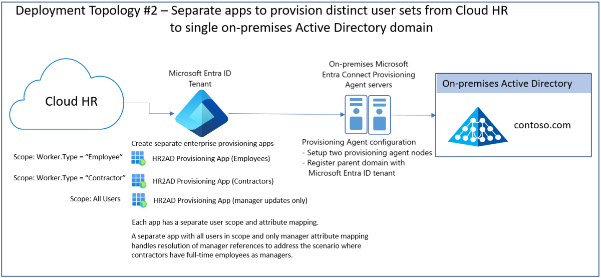 Microsoft Entra Connect 预配代理部署拓扑取决于你计划集成的云 HR 应用租户和 Active Directory 子域的数量。 如果有多个 Active Directory 域,它取决于 Active Directory 域是连续的还是非连续的。
