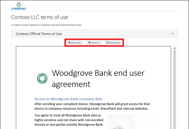 - PDF 格式的“使用条款”文档。 PDF 文件可包含需要显示的任何内容。 若要支持移动设备上的用户,PDF 中建议的字号是 24 点。