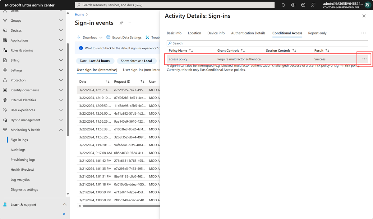 在登录事件中选择策略右侧的省略号以查看策略详细信息。 此选项为管理员提供有关政策被应用或未被应用原因的更多信息。