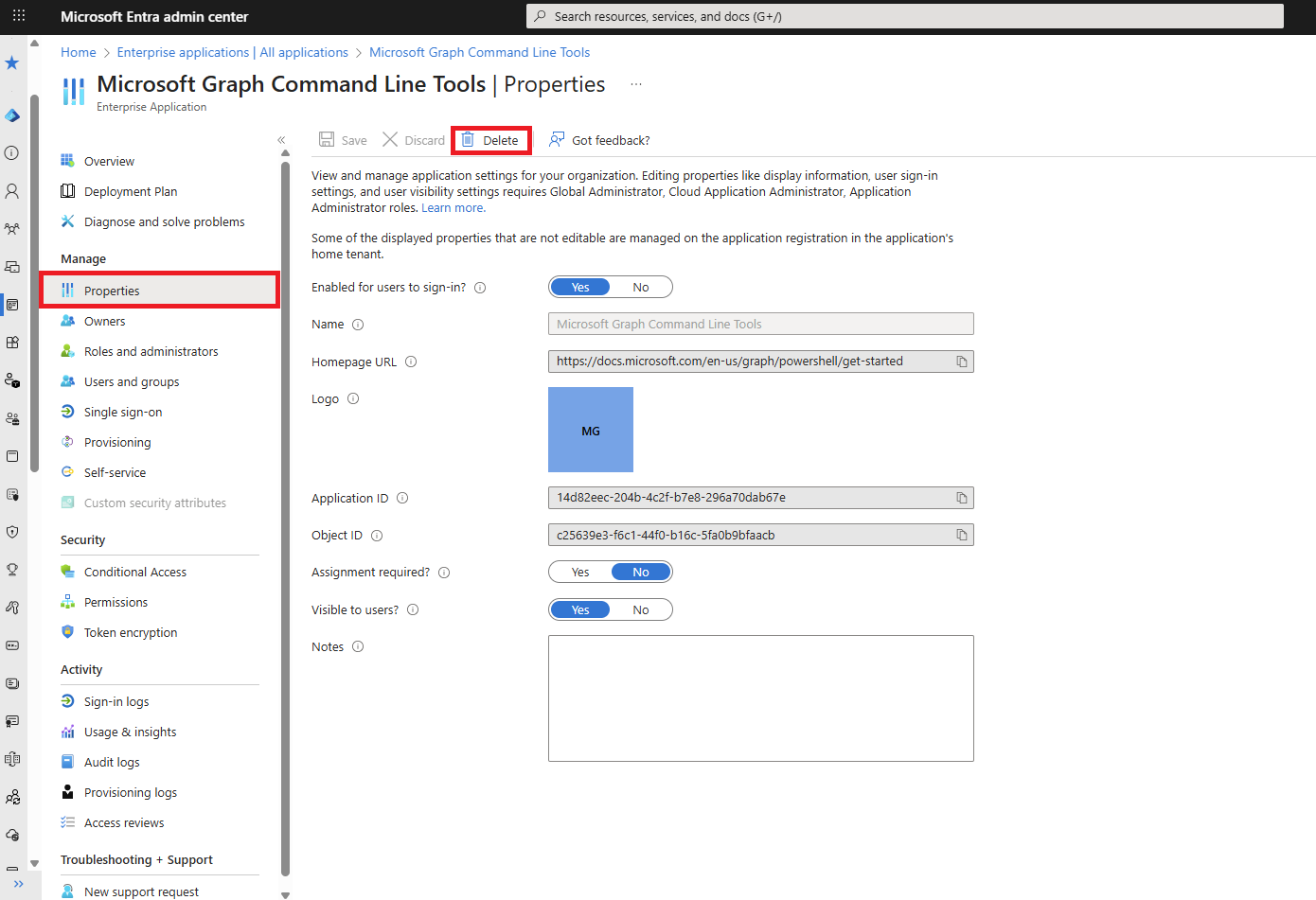 在“属性”窗格的顶部,选择“删除”,然后选择“是”以确认要从 Microsoft Entra 租户中删除该应用程序。