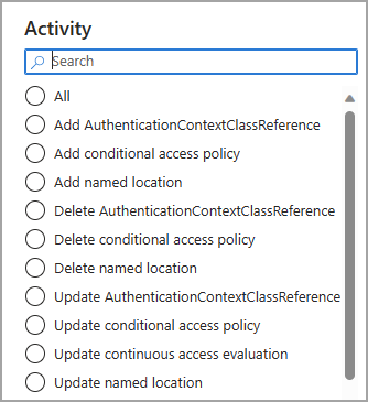 类别:默认为所有类别,但可以筛选以查看活动类别,例如更改策略或激活符合条件的 Microsoft Entra 角色。