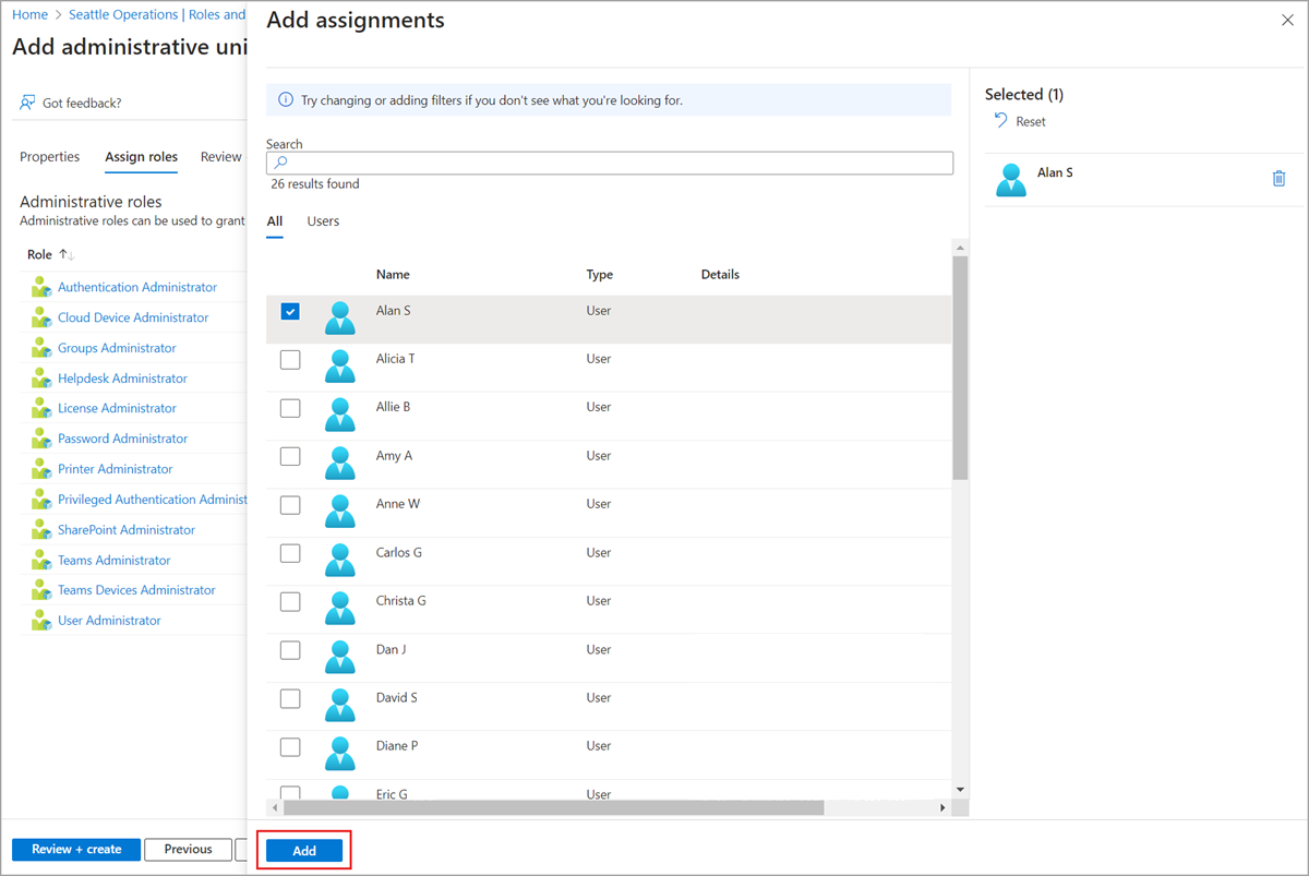 (可选)在“ 分配角色 ”选项卡上,选择一个角色,然后选择将角色分配给此管理单元范围的用户。