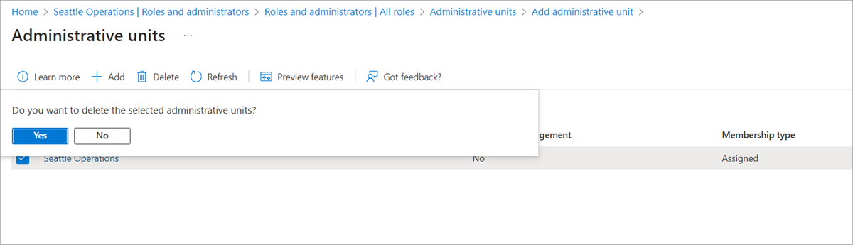 在 Microsoft Entra ID 中,可以删除不再需要作为管理角色范围单元的管理单元。 删除管理单元之前,应删除具有该管理单元范围的任何角色分配。