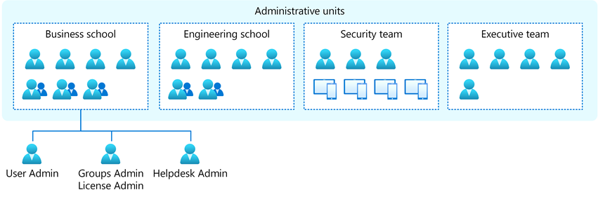 在由任何类型的独立部门组成的组织中,使用管理单元限制管理范围非常有用。 假设一个由多个自治学院(商业院、工程学院等)组成的大型大学示例。 每个学院都有一个 IT 管理员团队,他们负责控制访问、管理用户并为学校设置策略。