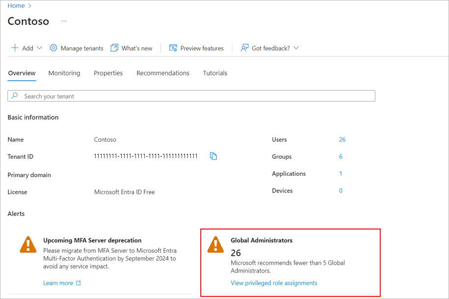 如果有 5 个或更多特权全局管理员角色分配,Microsoft Entra 概述页面上会显示“全局管理员”警报卡,以帮助你监视全局管理员角色分配。