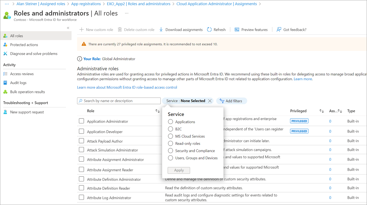 某些角色包括特权权限,例如更新凭据的功能。 由于这些角色可能会导致特权提升,因此应将这些特权角色分配的使用限制为组织中少于 10 个。 如果特权角色分配的数量超过 10 个,则会在“角色和管理员”页上显示警告。