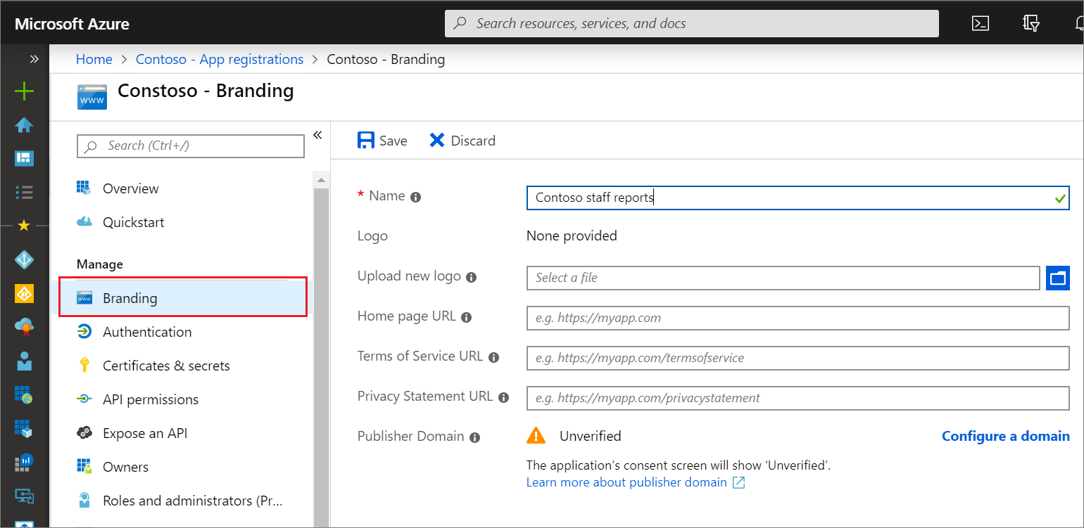 允许更新单租户和多租户应用程序中的名称、徽标、主页 URL、服务条款 URL 和隐私声明 URL 属性的能力。 授予对应用程序注册品牌页上的所有字段的访问权限: