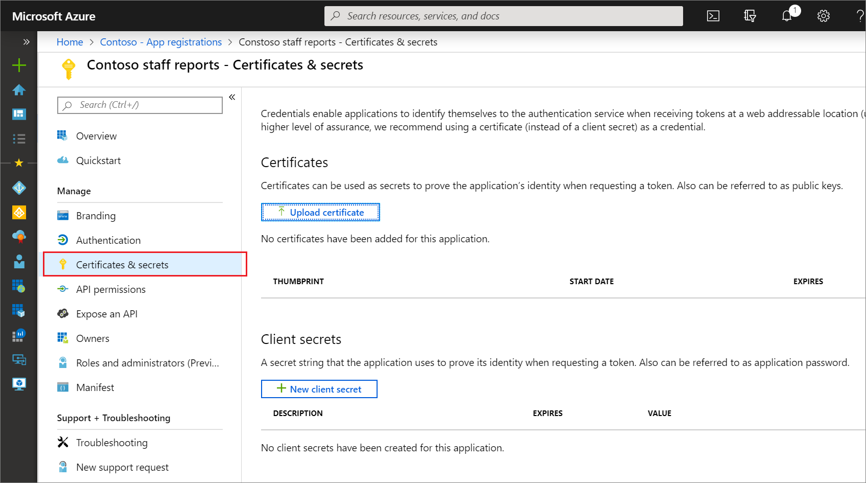允许更新单租户和多租户应用程序中证书和客户端机密属性的能力。 授予对应用程序注册证书和机密页上的所有字段的访问权限:
