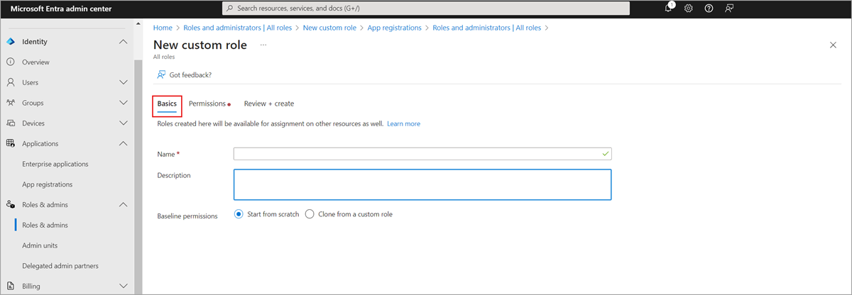 有关自定义角色的基础知识,请参阅 自定义角色概述。 只能在目录级范围或应用注册资源范围中分配角色。 有关可在 Microsoft Entra 组织中创建的自定义角色的最大数目的信息,请参阅 Microsoft Entra 服务限制和限制