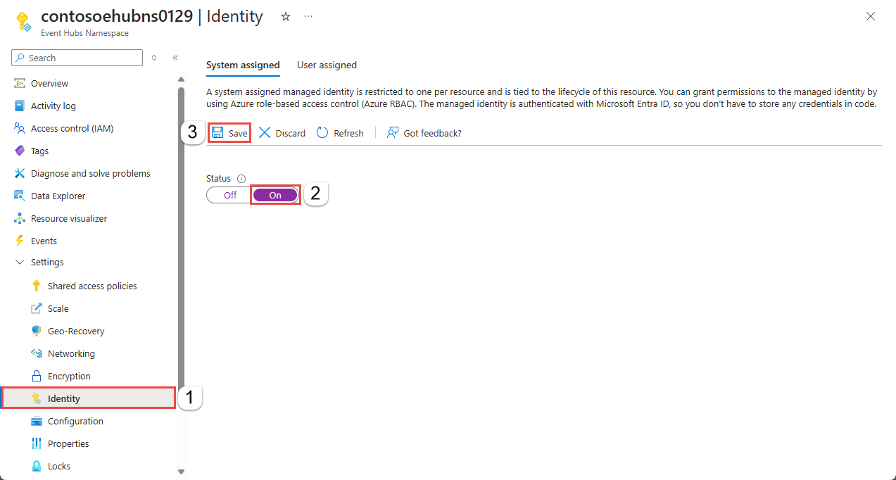 下面是使用 Azure 门户为事件中心命名空间启用系统分配的托管标识的步骤。