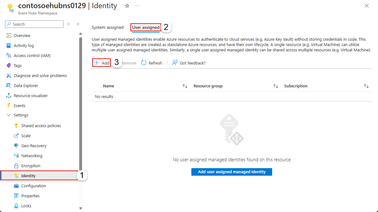 下面是使用 Azure 门户为事件中心命名空间启用用户分配的托管标识的步骤。
