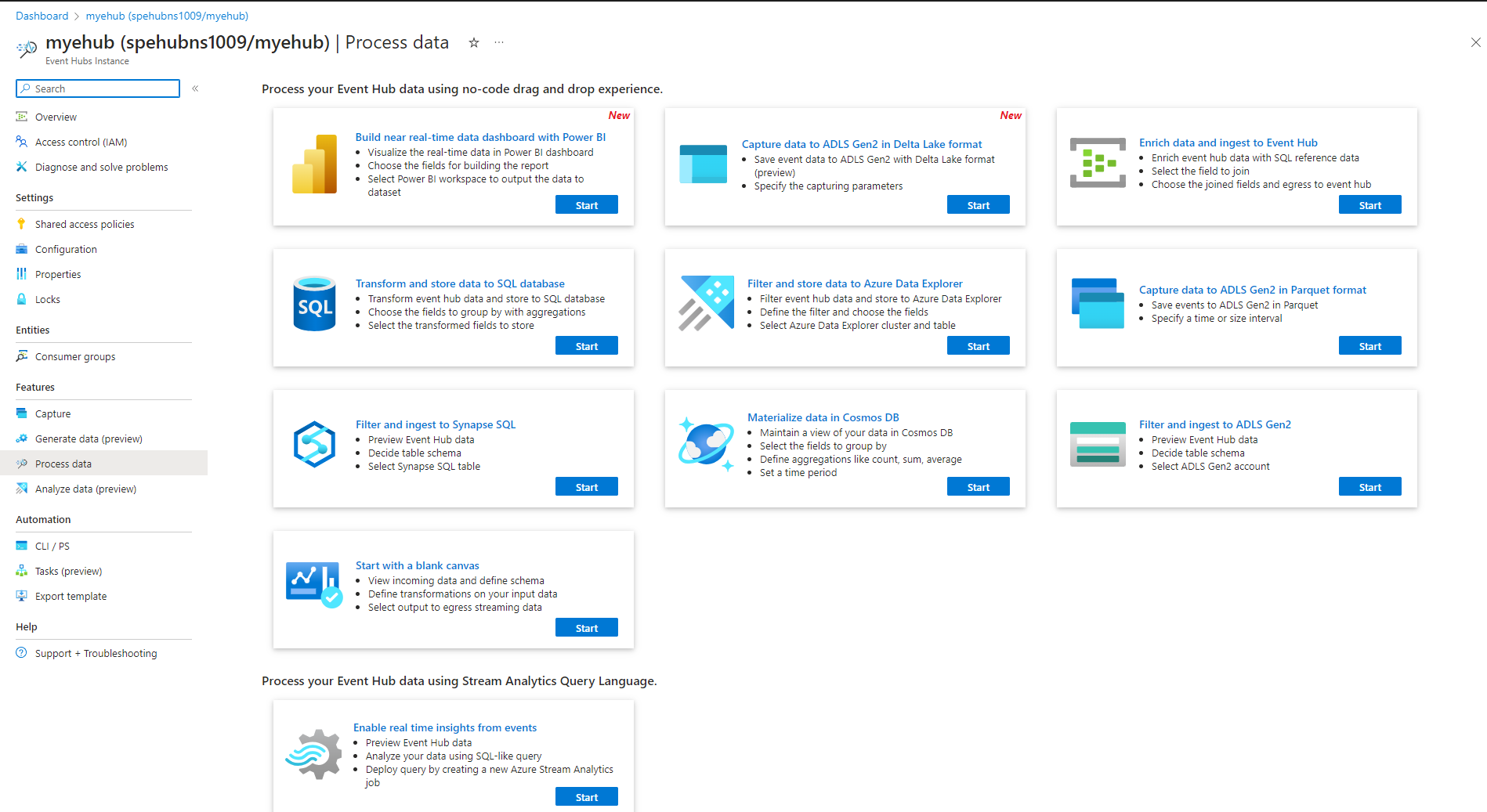 事件中心与 Azure 流分析集成,用于实时流处理。 使用内置无代码编辑器和拖放功能,或为复杂转换编写基于 SQL 的查询。