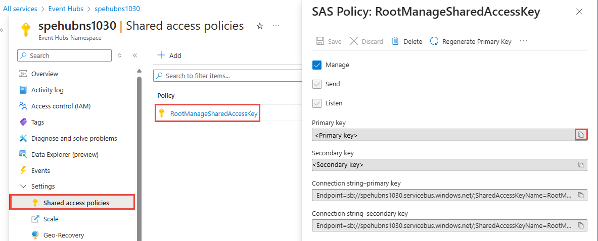 Get-AzEventHubKey -ResourceGroupName MyResourceGroupName -NamespaceName MyNamespaceName -EventHubName MyEventHubName -AuthorizationRuleName MyAuthRuleName