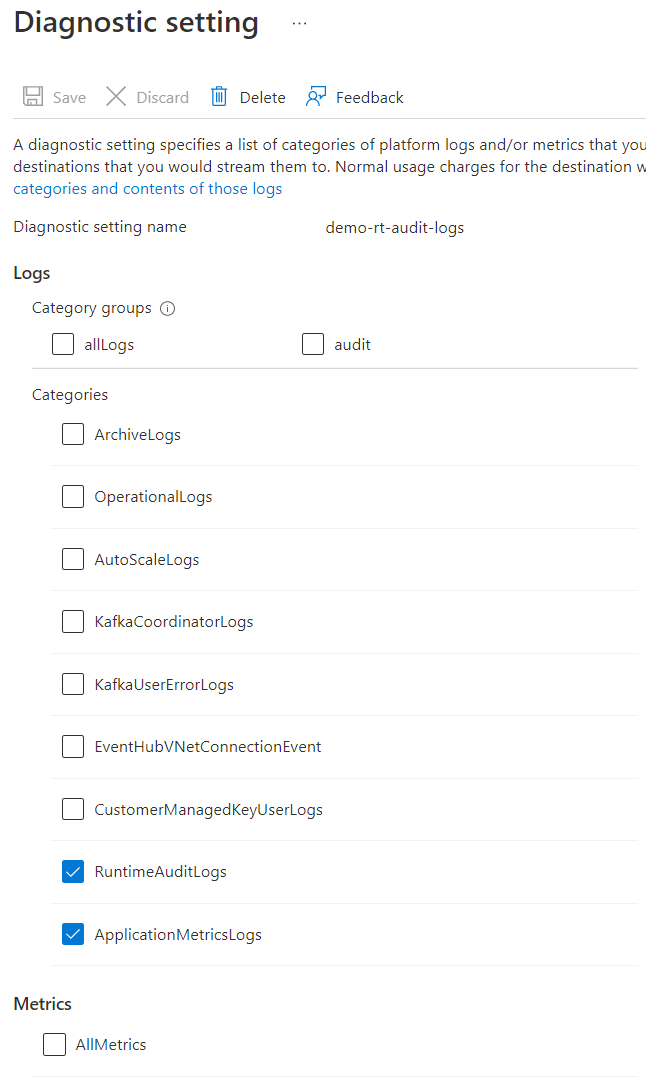 然后,可以根据需要启用日志类别:RuntimeAuditLogs 或 ApplicationMetricsLogs。