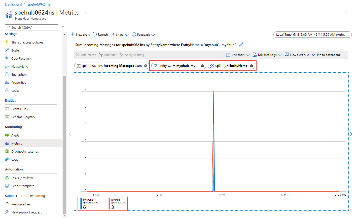 对于支持维度的指标,应用筛选器时可以使用维度值。 例如,将设置为 EntityName 的筛选器添加到事件中心的名称。 还可以按维度来拆分指标,将指标的不同部分进行直观比较。 有关筛选和拆分的详细信息,请参阅 Azure Monitor 的高级功能。