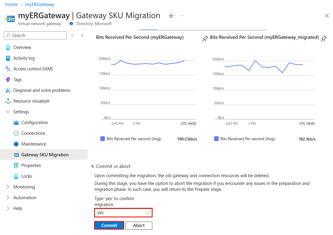 - 在提交之前,请验证新虚拟网络网关是否具有正常工作的 ExpressRoute 连接,并确认流量正在流经新连接。