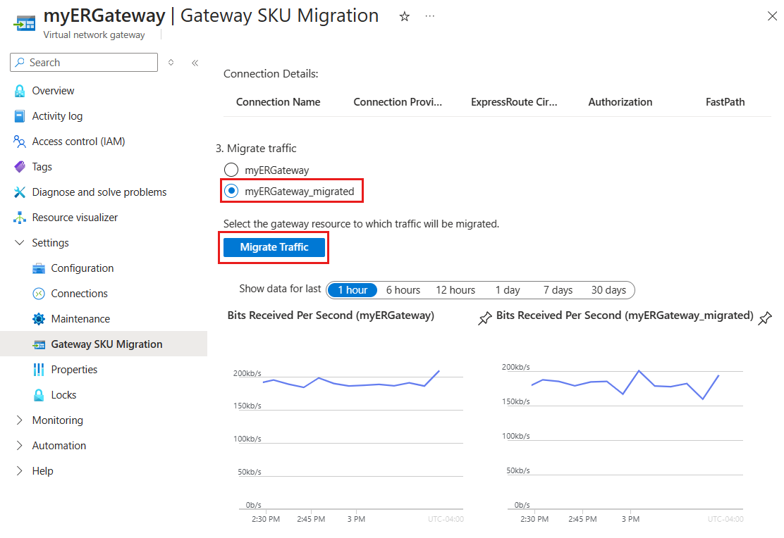 创建新网关后,继续执行 Migrate 阶段。 选择新网关(例如 ,myERGateway_migrated),将设置从旧网关传输到新网关。 所有网络流量和数据路径连接传输。 选择“ 迁移流量 ”以启动该过程。 此步骤最多可能需要 5 分钟。