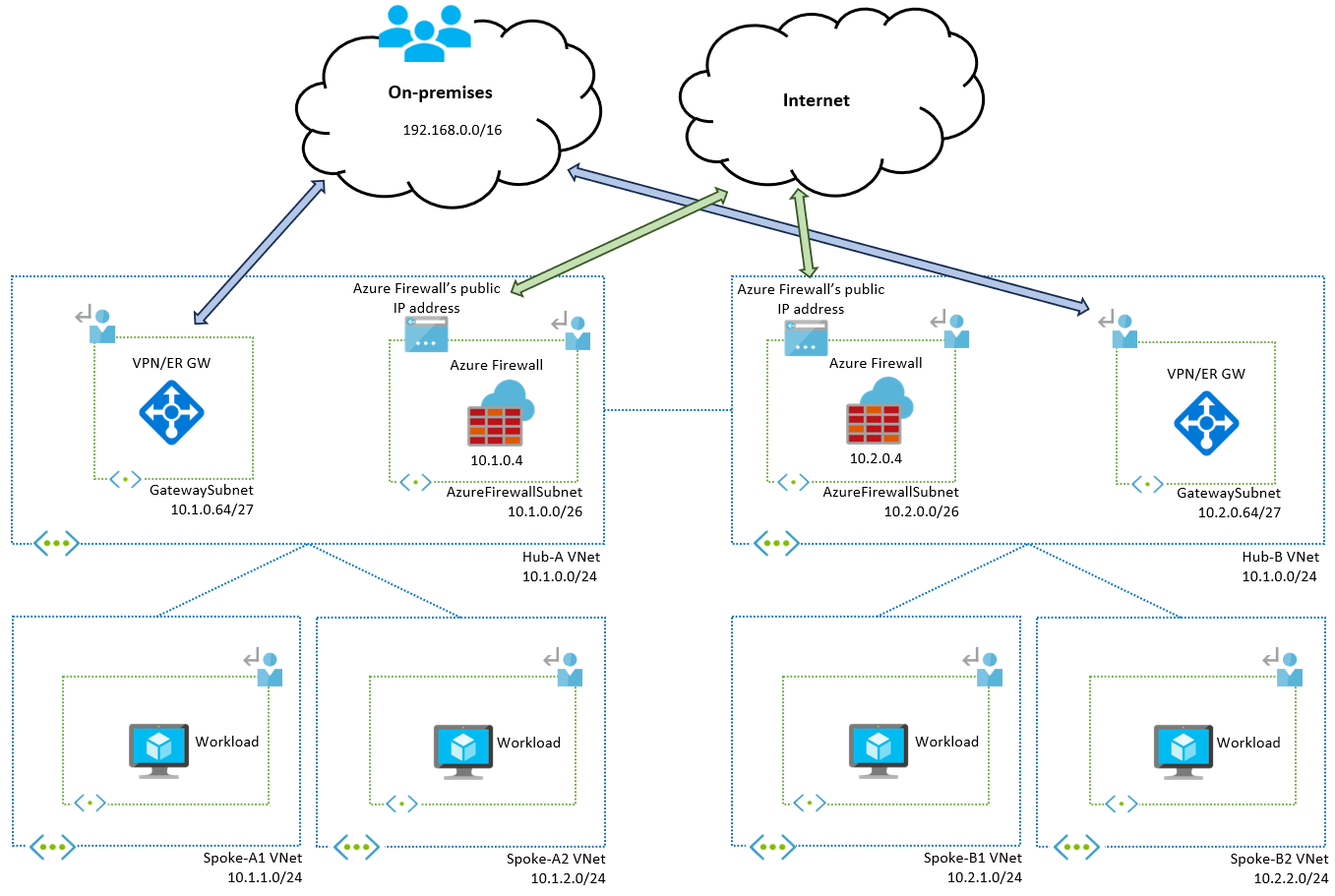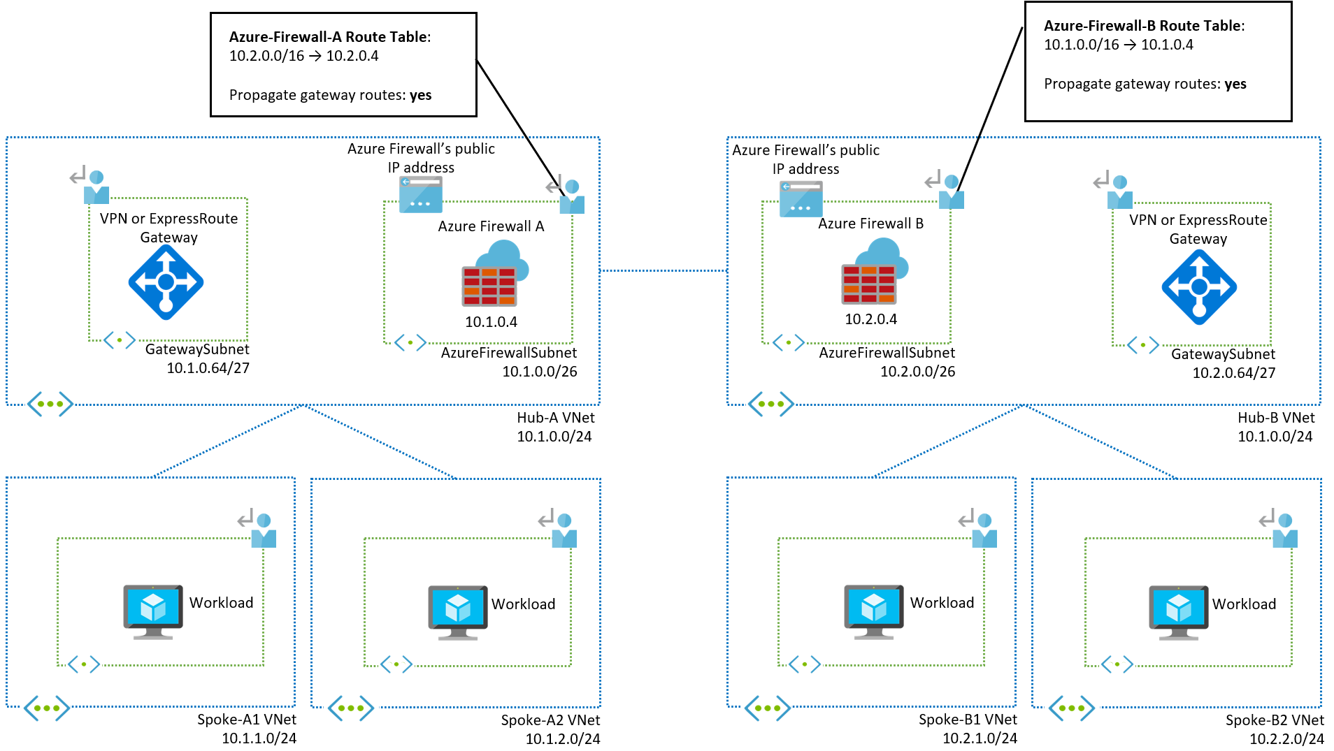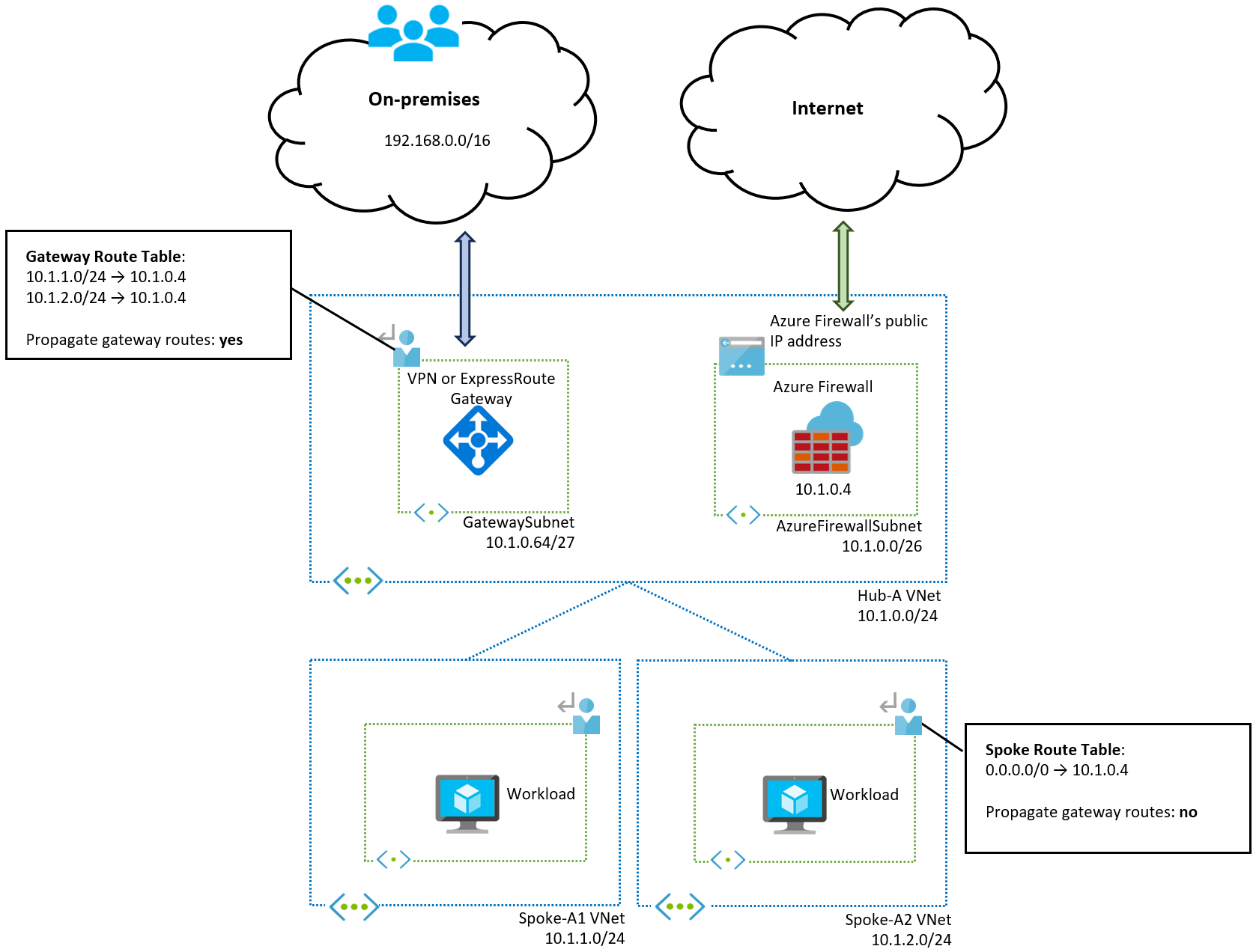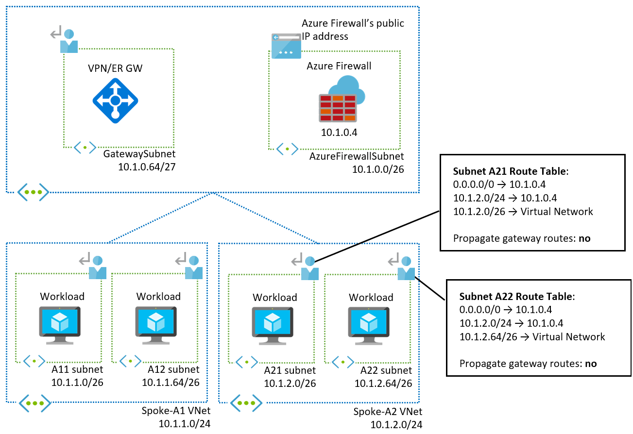 10.1.0.0/24(在本示例中)配置路由会替代中心虚拟网络的系统路由。 这会导致 VPN 或 ExpressRoute 网关之间的子网内控制流量被发送到防火墙,从而可能中断网关作业。 -