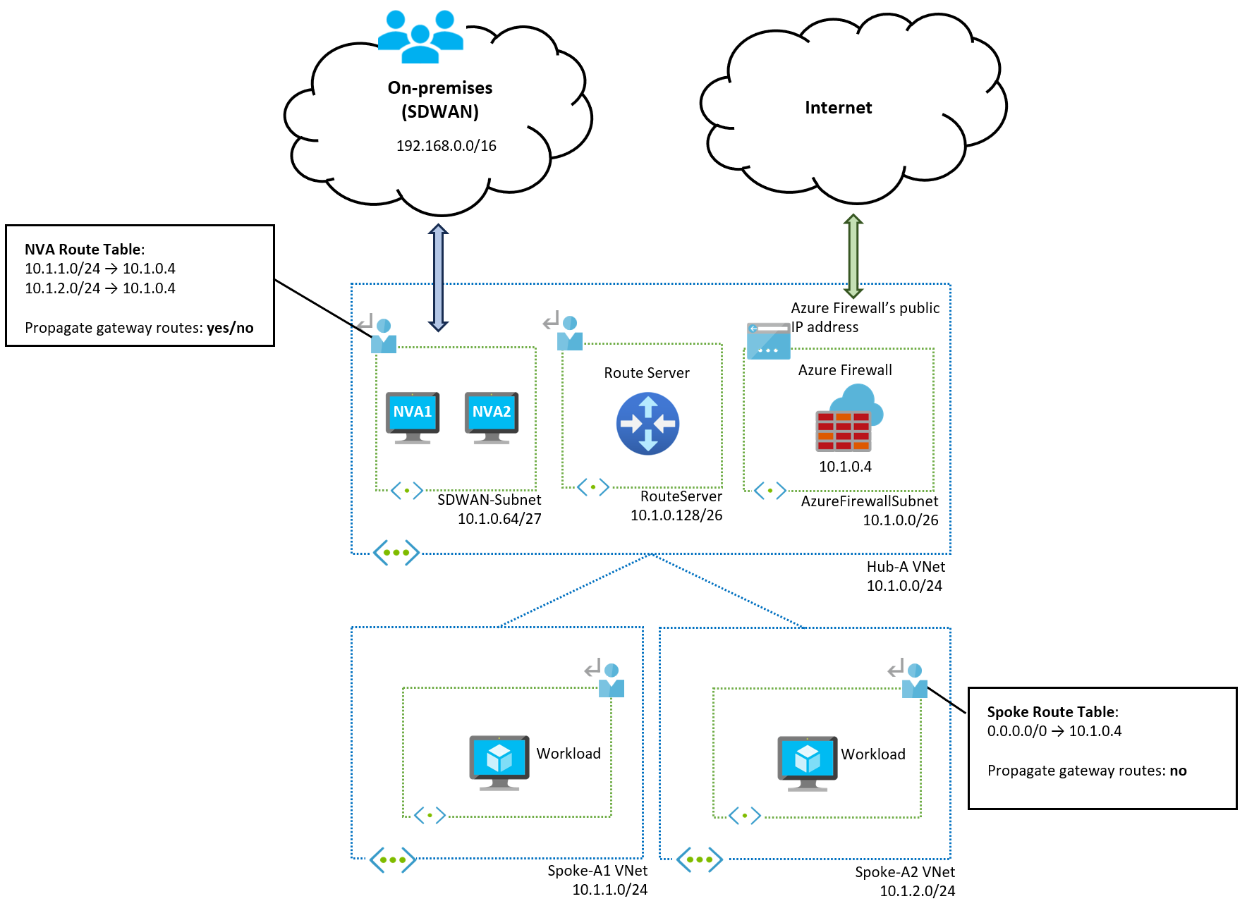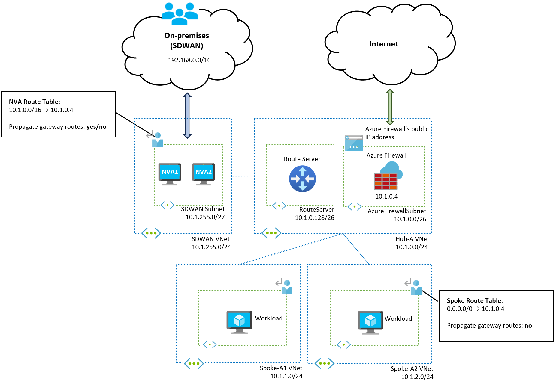 如果不想在与 NVA 子网关联的路由表中配置每个子网虚拟网络的前缀,可以将 SD-WAN NVA 放置在其专用虚拟网络中。 NVA 虚拟网络不会了解辐射前缀,因为它们没有直接对等互连,摘要路由如下图所示:
