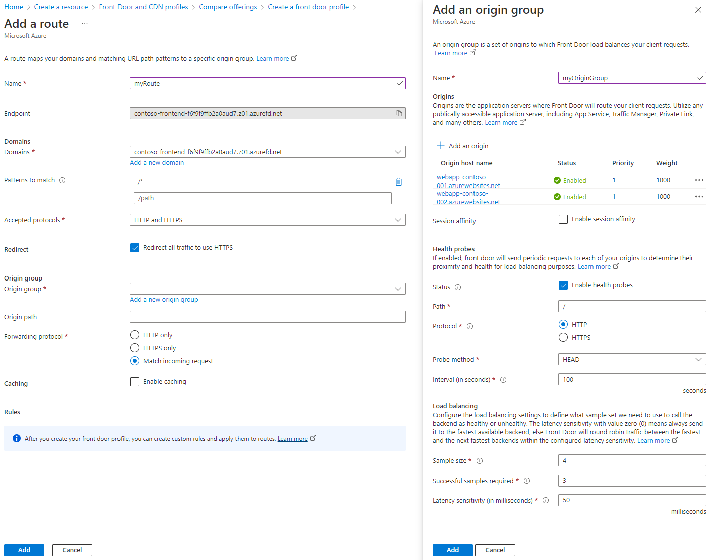 Setting Description Name 提供一个名称来标识域和源组之间的映射。 Domains 系统将生成一个域名供你使用。 若要添加自定义域,请选择“添加新域”。 此示例使用默认域名。 匹配模式 指定此路由接受的 URL。 此示例使用默认设置,该设置接受所有 URL 路径。 接受的协议 选择路由接受的协议。 本示例既接受 HTTP 请求,又接受 HTTPS 请求。 Redirect 启用此设置,将所有 HTTP 请求重定向到 HTTPS 终结点。 源组 若要创建新的源组,请选择“添加新的源组”,然后输入 myOriginGroup 作为源组名称。 接下来,选择“+ 添加源”,再输入 WebApp1 作为名称,输入“应用服务”作为源类型。 在 主机名中,选择 webapp-contoso-001.chinacloudsites.cn ,然后选择“ 添加 ”以将源添加到源组。 重复上述步骤,将第二个 Web 应用添加为源,使用 WebApp2 作为名称,webapp-contoso-002.chinacloudsites.cn 作为主机名。 为每个源选择一个 优先级 ,数字越小表示优先级越高。 如果需要 Azure Front Door 为这两个源提供服务,请将优先级设为 1。 为每个源选择一个权重,权重确定流量如何路由到源。 如果需要将流量平均路由到两个源,请选择相等权重 1000。 添加这两个 Web 应用源后,选择“ 添加” 以保存源组配置。 源路径 请将此字段留空。 转发协议 选择源组接收的协议。 此示例使用与传入请求相同的协议。 Caching 若要使用 Azure Front Door 的边缘 POP 和 Microsoft 网络将内容全局缓存到更靠近用户的位置,请选择此复选框。 Rules 部署 Azure Front Door 配置文件后,可以使用规则来自定义路由。 重要