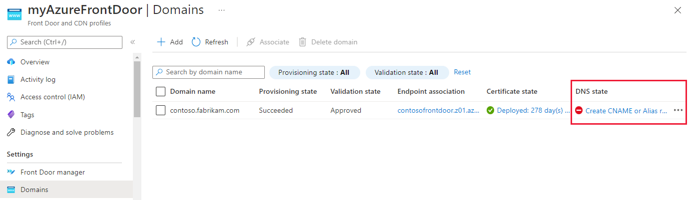 有关域验证状态的详细信息,请参阅 Azure Front Door 中的域。