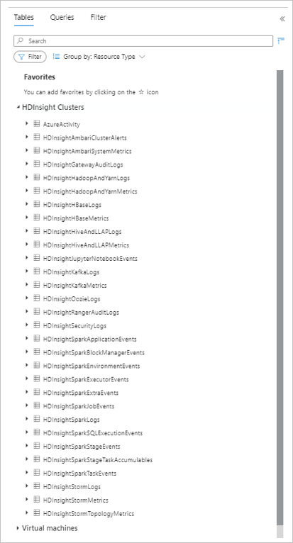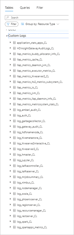 - 如果按“资源类型”对表进行分组,则表位于“HDInsight 群集”部分下,如下图所示 。
