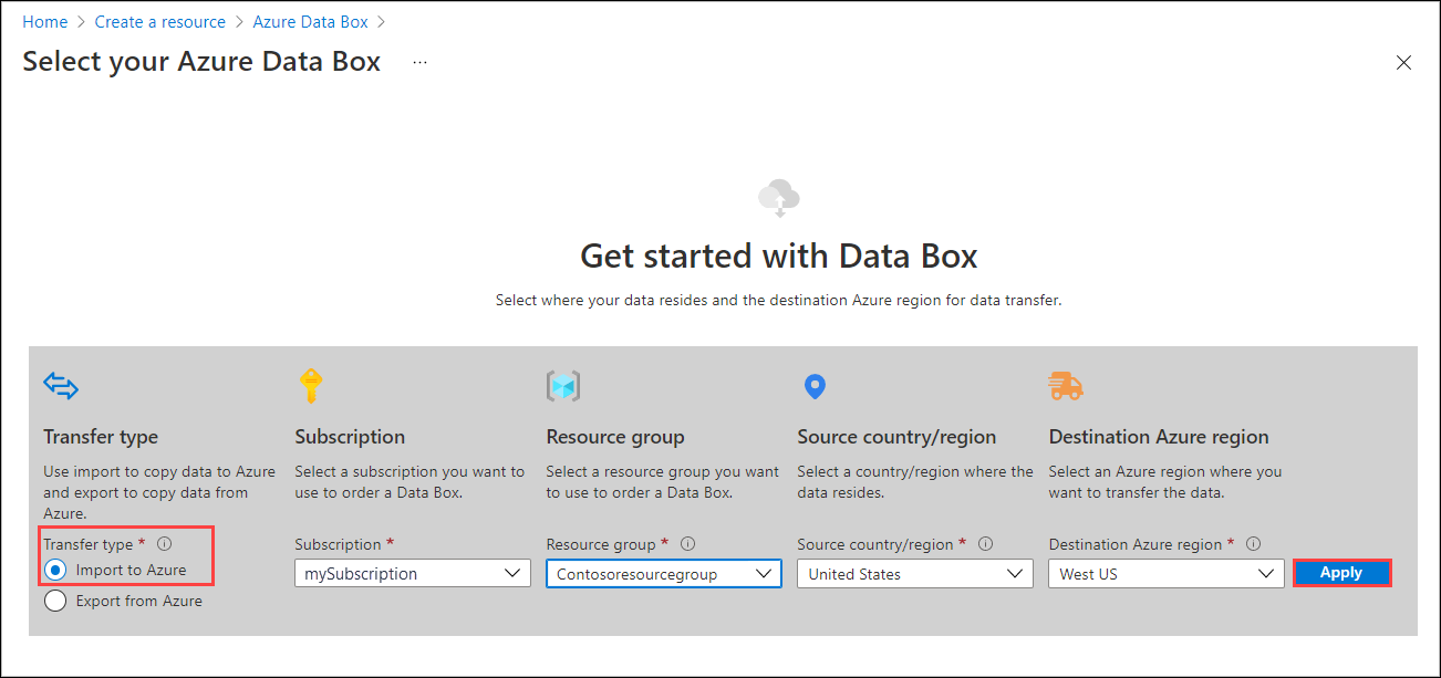 选择“+ 创建资源”并搜索 Azure Data Box。 选择“Azure Data Box”。