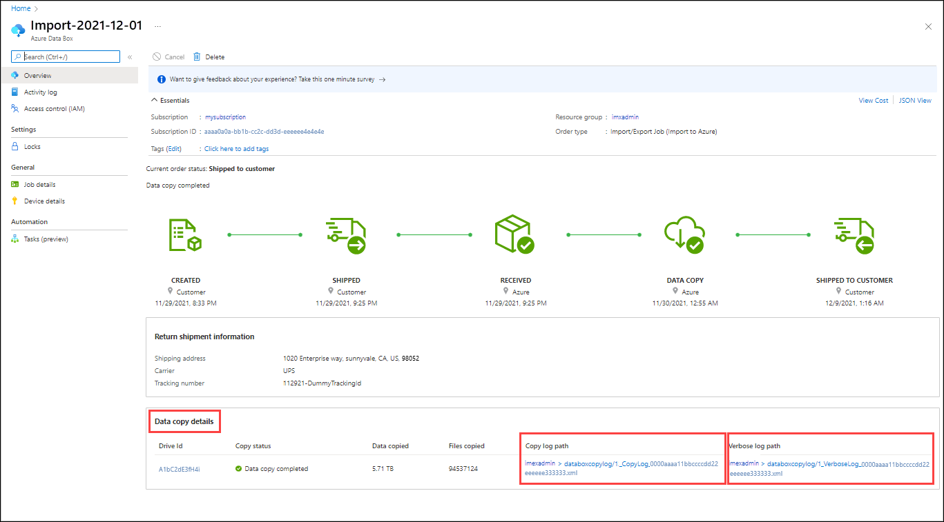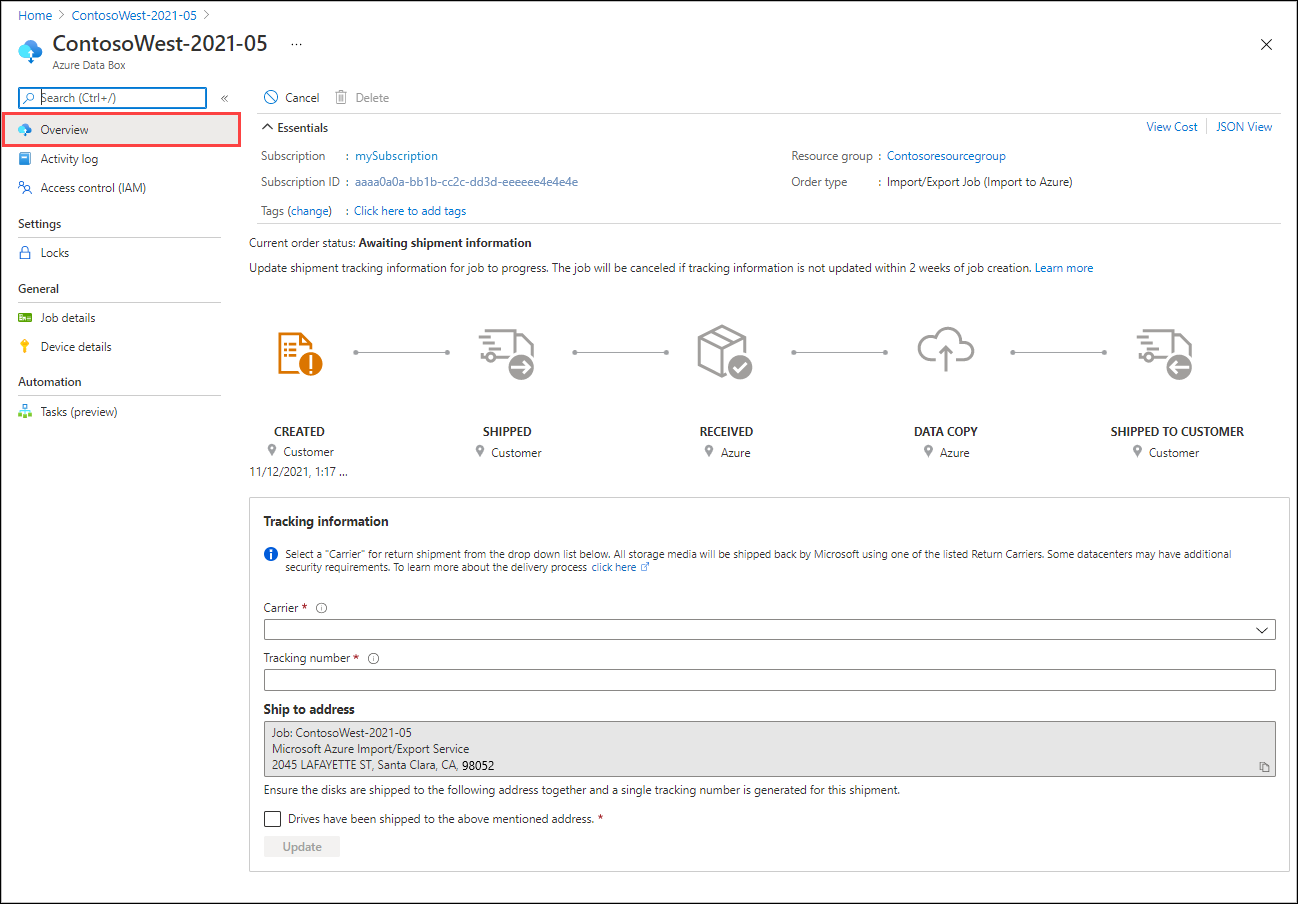 - 查看作业信息。 记下作业名称和 Azure 数据中心送货地址,以便将将磁盘寄回。 稍后将在发货标签中使用此信息。
