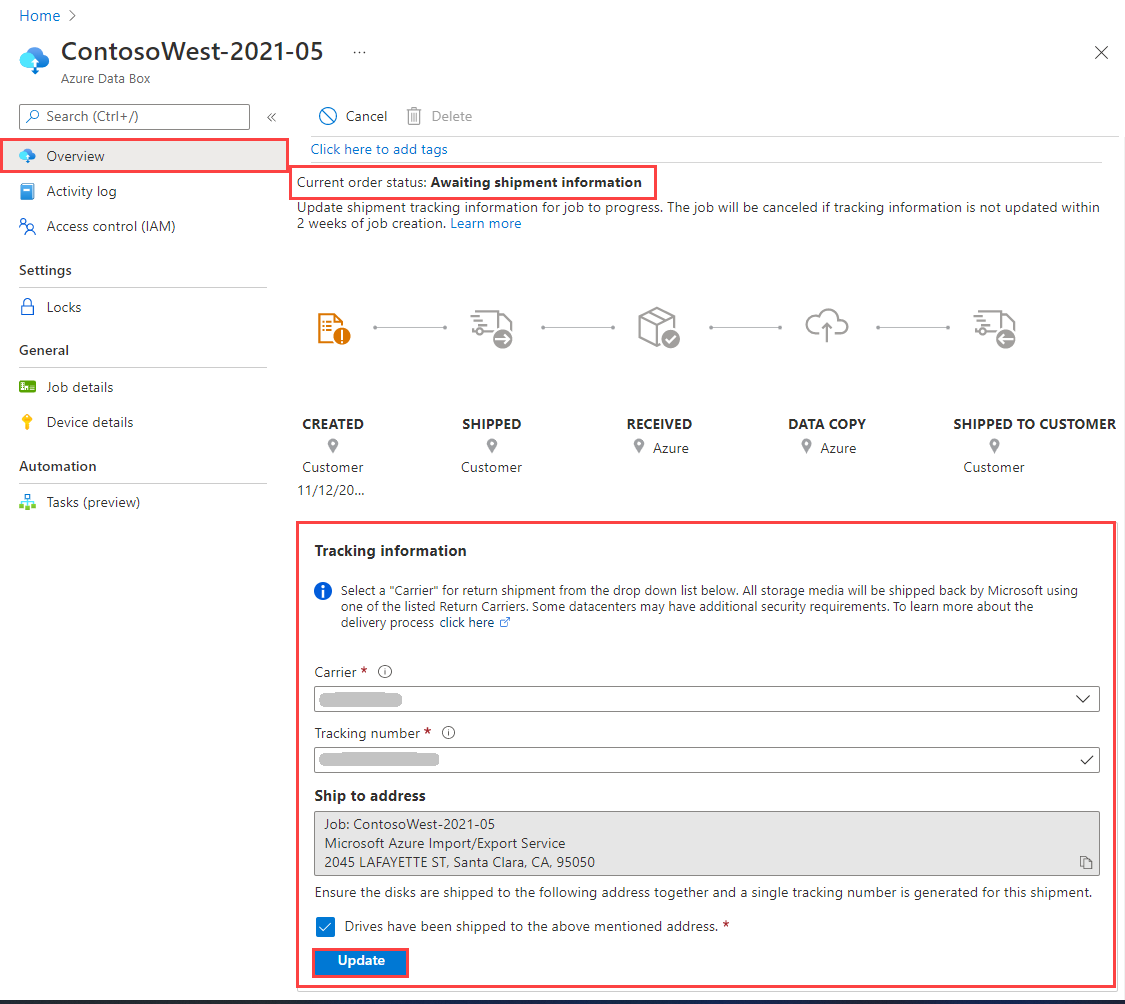 将磁盘发货后,返回 Azure 门户中的作业并填写跟踪信息。