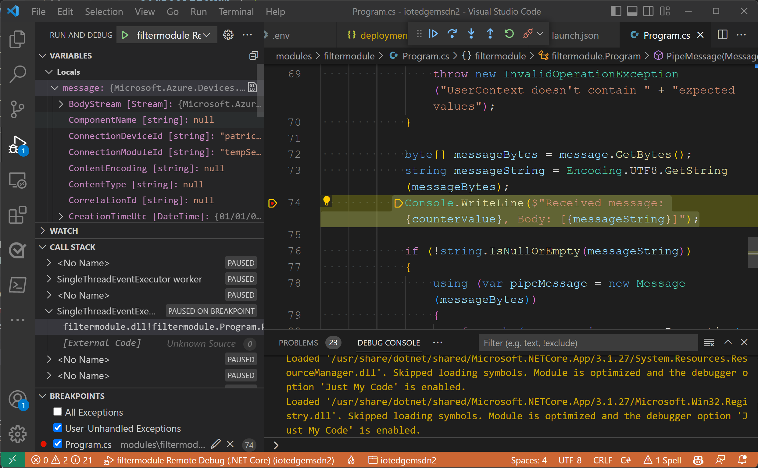 本文介绍如何使用 Visual Studio Code 调试多种语言的 IoT Edge 模块。 在开发计算机上,使用 Visual Studio Code 在本地或远程模块容器中附加和调试模块。