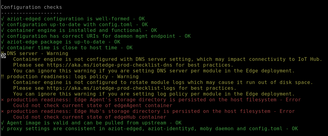 可以预期一系列响应可能包括 “确定 ”(绿色)、 警告 (黄色)或 “错误 ”(红色)。 有关排查常见错误的信息,请参阅 Azure IoT Edge 常见问题的解决方案。