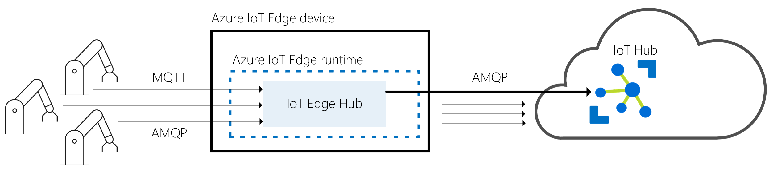 IoT Edge 中心是构成 Azure IoT Edge 运行时的另一个模块。 它通过公开与 IoT 中心相同的协议终结点,充当 IoT 中心的本地代理。 这种一致性意味着客户端可以连接到 IoT Edge 运行时,就像连接到 IoT 中心一样。
